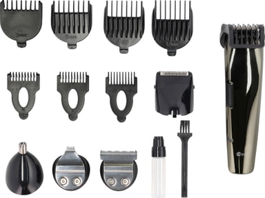 Både trimmeren og hele sættet har et elegant sort design, der passer perfekt på din hylde, og funktionelt kan trimmeren tage sig af dine ører, næse og endda dit hår.