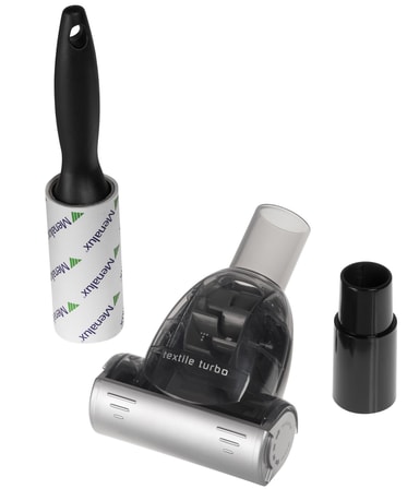 Mini Textile Turbo er et mundstykke til praktisk og effektiv rengøring af møbler og gardiner, mens rullen fjerner støv og hår.