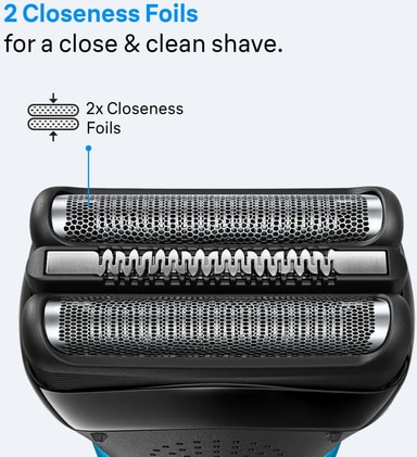 Braun Series 3 er udstyret med 2 foliebarberblade og 1 midtertrimmer til barbering af længere hår, så du får en tæt og ren barbering.