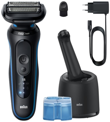 Æsken indeholder Braun Series 5 barbermaskine, 4-i-1 SmartCare Center, rensepatron, oplader og rensebørste - alt hvad du behøver til en komplet barberingsrutine.