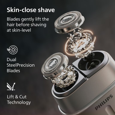 Lift & Cut-teknologien løfter forsigtigt håret før klipning, hvilket giver en tættere barbering og samtidig hjælper med at beskytte huden.