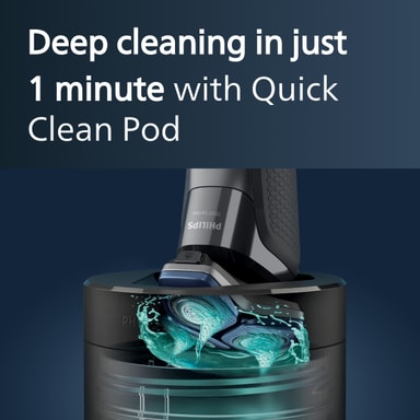 Barbermaskinen kommer med en praktisk rejsetaske, et opladningsstativ og et USB-A-kabel (uden strømadapter). Du får også en Quick Clean Pod sammen med en patron, som renser og smører din barbermaskine på kun et minut.