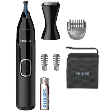 Philips næsetrimmer i serie 5000 trimmer skånsomt næsehår, ørehår, øjenbryn og detaljer. Den nye PrecisionTrim-teknologi og Protective Guard-systemet er designet til at sikre nem og effektiv trimning uden at trække eller hive.