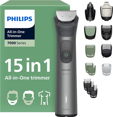 Philips All-in-One Series 7000 multigroomer MG7921/15 er en 15-i-1 trimmer til ansigt, hår og krop. Den har selvslibende skær, en præcisionskam og flere tilbehørsdele til nem og præcis grooming.Læs mere om produktet