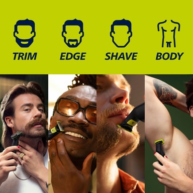 Med Philips OneBlade 360 ansigts- og kropstrimmeren kan du barbere enhver hårlængde, takket være OneBlade-teknologiens hurtigbevægelige skær (12000x pr. minut) med et dobbelt beskyttelsessystem, der giver dig en effektiv og behagelig barbering på længere hår.
