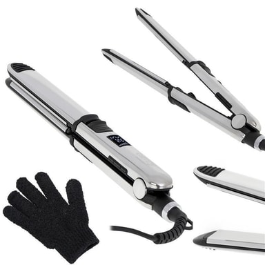 Plattång säker för allt hårDet är inte bara tillverkat av högkvalitativa material utan har också intressanta tekniska lösningar som gör det säkert och enkelt att använda enheten. LCD-skärmen på en central plats gör att du kan hålla koll på temperaturen. Automatisk avstängning efter 60 minuter kommer att vara till nytta för glömska människor som är rädda för att lämna arbetsenheter. Cool-touch-spetsarna, den 360 roterande sladden och skyddshandsken som ingår i setet garanterar säker användning av plattången.