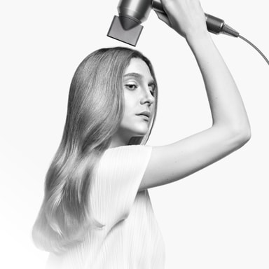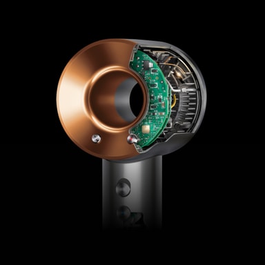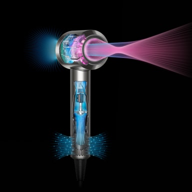 Dysons Air Multiplier-teknologi forstærker luftstrømmen og skaber en højtryks, højhastigheds luftstrøm til hurtig tørring og kontrolleret styling, uden at være afhængig af høj varme.