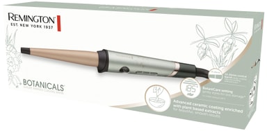 Få naturligt udseende krøller med Remington Botanicals krøllejernet CI5860. Den har en 13-25 mm keramisk belagt cylender med plantebaserede ekstrakter, der fremmer smidighed og glans. Redskabet varmes op på kun 30 sek. og har 10 varmeindstillinger.Læs mere om produktet