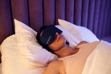 SleepMask søvnmasken fra Therabody, lavet af komfortabelt stof, sikrer fuld mørklægning og har bløde vibrationer i 3 mønstre for hurtigere søvn. Den er genopladelig og bærbar.Læs mere om produktet