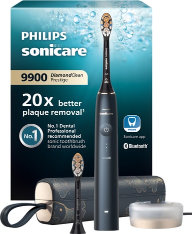 Philips Sonicare DiamondClean Prestige 9900 el-tandbørsten HX9992/42 fjerner 20 gange mere plak og har en batterilevetid på over 2 uger. Den forbindes til Sonicare-appen og inkluderer 2 A3 Premium All-in-One børstehoveder for optimal tandkødspleje.Læs mere om produktet