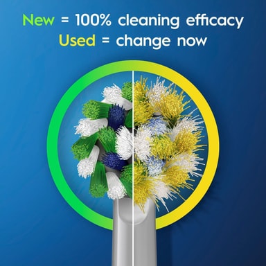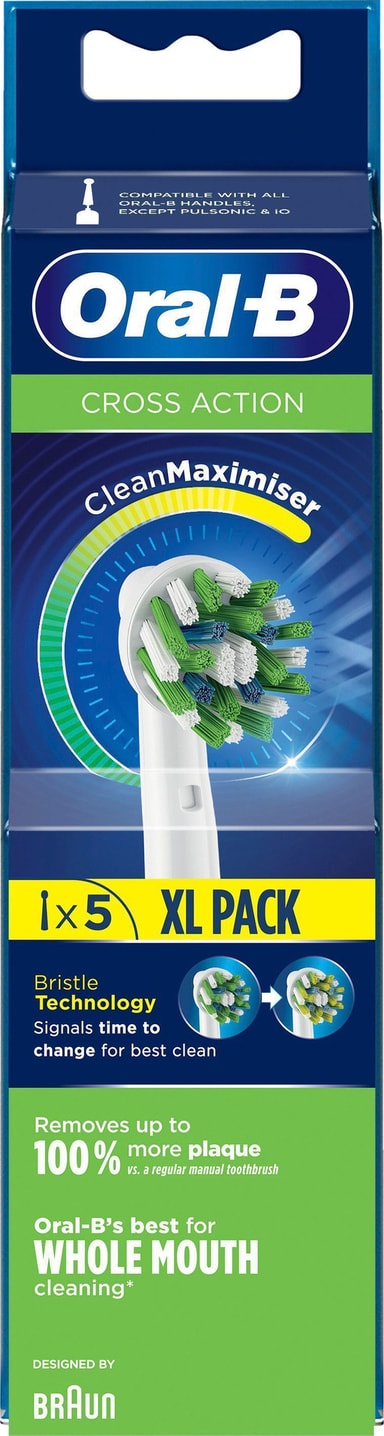 Oral-B Cross Action-tandbørstehovederne 321217 har børstehår, der er vinklet 16 grader, så de kan nå ind mellem tænderne og fjerne op til 100 % plak sammenlignet med en almindelig manuel tandbørste. Desuden skifter børstehårene fra grøn til gul for at indikere, at de skal skiftes, takket være CleanMaximiser-teknologien. Børstehovederne passer til alle Oral-B's elektriske tandbørster bortset fra iO- og Pulsonic-modellerne.