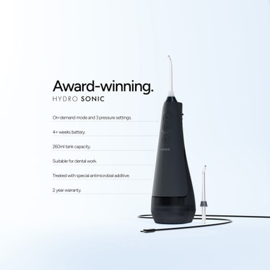 Tandrenseren har en 260 ml vandtank og et buet, riflet design med en slank dyse for præcis rengøring. Praktisk placerede trykindstillinger og tænd/sluk-knapper på forsiden sikrer nem betjening.