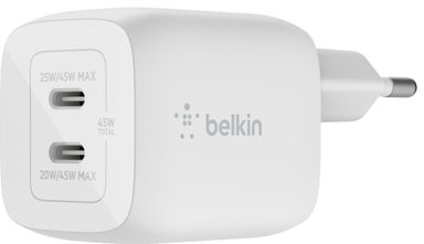 Belkin 45W Dual USB-C opladeren giver dig to USB-C porte, så du nemt og hurtigt kan oplade dine enheder. Oplad en enkelt enhed med op til 45 W eller oplad to med 25 og 20 W samtidig. Få sikker opladning med Power Delivery 3.0 og PPS.Læs mere om produktet