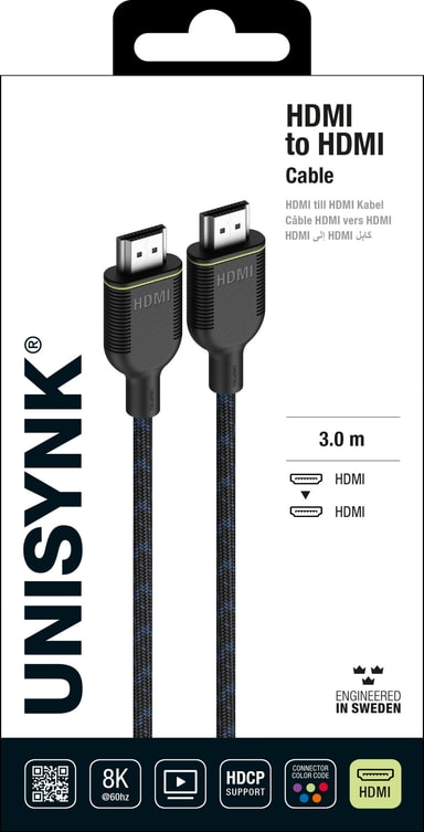 Få det bedste ud af din skærm med Unisynk 8k60Hz HDMI-kablet. Dette kabel med en 48 Gbps båndbredde og HDCP 2.2-understøttelse sikrer transmissioner i op til 8K-kvalitet og 60 Hz opdateringshastighed til dit tv og andre skærme.Læs mere om produktet
