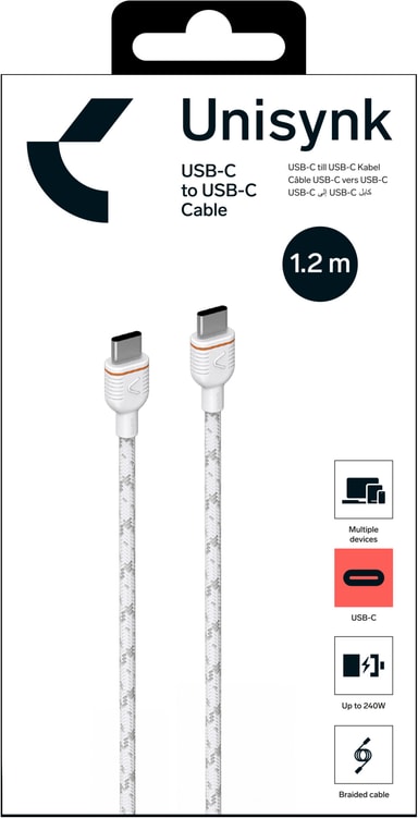 Unisynk USB-C til USB-C opladningskablet er 1,2 meter langt og fremstillet af holdbart nylon med et flettet rundt design. Det understøtter hurtig opladning op til 240 W.Læs mere om produktet