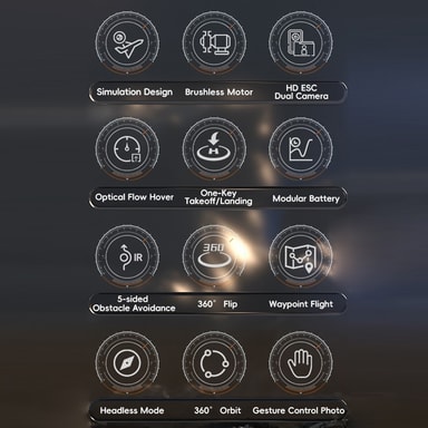 Et-tast start/en-tast landing/opstigning/nedstigning/venstre/højre drejning/foto/video/360° rulning/hovedløs tilstand/hurtigt og langsomt gear/retningsfinjustering/5-sidet forhindringsforhindring/optisk flowsvævning