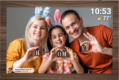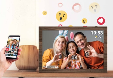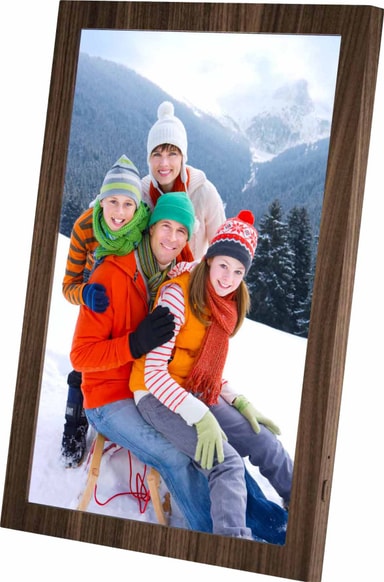 Den enkle brune ramme med træfinish passer perfekt til de fleste indretninger, uanset om den står på natbordet, på en hylde i køkkenet eller på væggen i stuen. Rammen kan monteres på væggen takket være et VESA 100-beslag, og den har også et lille stativ på bagsiden. Derudover har Frameo et indbygget ur og kalender samt en tidsplan for til- og frakobling, så du ikke bliver forstyrret om natten. Hold dine minder tæt på.