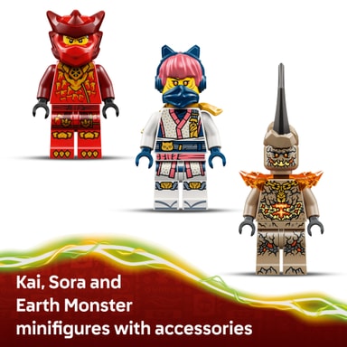 • 3 NINJAGO®-MINIFIGURER – Ninjalegetøjet omfatter Kai, Sora og et skurke-jordmonster, så ninjafans kan udspille actionfyldte kampe mellem det gode og det onde