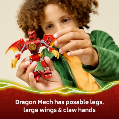 Drenge, piger og fans af tv-serien NINJAGO®: Dragerne vågner fra 6 år kan nyde timevis af fantasifuld leg med LEGO® NINJAGO byggesættet Kais drage-mech – kamppakke (71851). Legesættet indeholder en drage-mech med bevægelige ben, store vinger, kløer og en overkrop, der kan drejes 360 grader, samt et cockpit med plads til en minifigur.