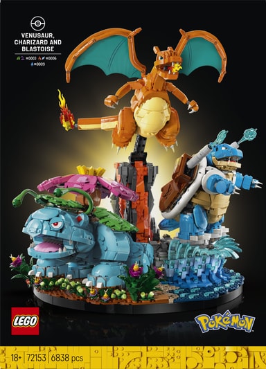 • STØRRELSE – Pokémon-byggesættet med 6.838 elementer omfatter samlerfigurer af Venusaur, Charizard og Blastoise, der er henholdsvis 23 cm, 20 cm og 18 cm høje
