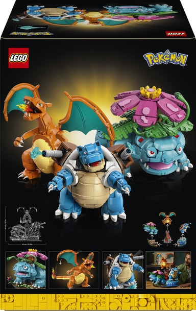Det episke sæt med 6.838 elementer indeholder 3 Pokémon-actionfigurer: Venusaur med bevægelige lianer og fødder, Blastoise med et leddelt hoved, arme og vandkanoner, og Charizard med justerbare vinger, ben, arme og hoved. Pokémon-modelsættet gemmer på en skjult overraskelse, der venter på at blive opdaget. Hver figur kan stå alene eller monteres på en stand med strand-, jungle- og vulkanbiomer, som repræsenterer hver Pokémons type og udgør en episk slagmark.