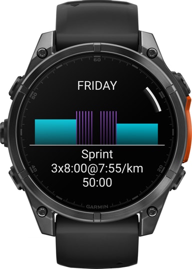 Fenix 8 kommer med en fantastisk 1,4″ AMOLED-skærm med en opløsning på 454 x 454 pixels, der giver dig en detaljeret og intuitiv brugergrænseflade, levende farver og dyb sort.