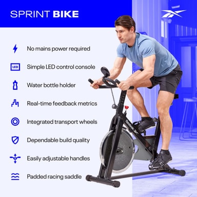 Perfekt til hjemmespin-træning eller længere udholdenhedsture, Sprint Bike er ideel til at følge med i enhver online træningstime eller presse dig selv gennem fitness-apps giver dig mulighed for at deltage i endeløse cykeltimer hjemmefra. Med en polstret racer-inspireret sadel med både lodret og vandret justering giver cyklen fuld kontrol over din kørestilling. Den let justerbare sadel og håndtagene giver større komfort til effektive ture og ledsages af pedaler i bur med justerbare stropper for mere fastlåst ydeevne. Med en indbygget vandflaskeholder giver Sprint Bike dig mulighed for at forblive hydreret for at få hver træning til at tælle