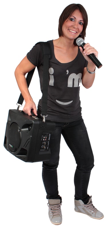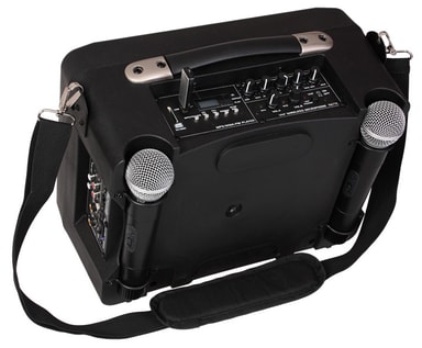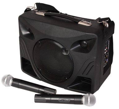 Tranportabelt PA med genopladeligt batteri.Afspil fra USB/MP3/SD-kort/BluetoothInkl. fjernbetjeningOplad i bilen med DC-ledning med cigaretænderstikInkl. 2 trådløse UHF-mikrofoner 865 og 863MHzDiskant og bas kontrolRumklang-effekt på mikrofonen Skulderrem