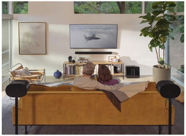 To Era 300-højttalere skaber surroundlyd med en soundbar i en stue