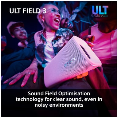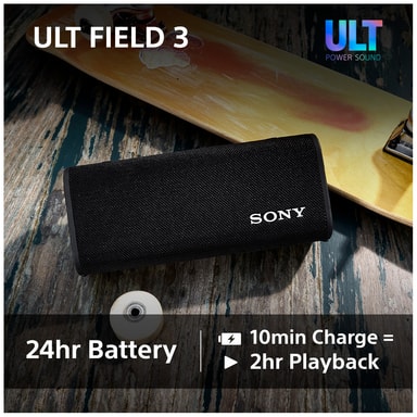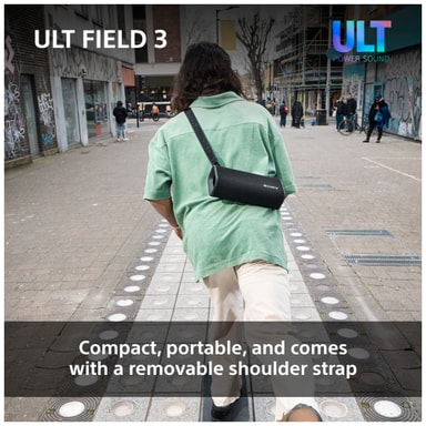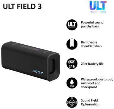 Denne Sony ULT Field 3 bærbare højttaler leverer en intens og kraftfuld lyd i en kompakt og holdbar indpakning. Forbind dine smart-enheder via Bluetooth og nyd dine yndlingsnumre eller podcasts. Med 24 timers spilletid, ULT Power Sound og IP67 støv- og vandtæt klassificering er denne bærbare højttaler den ideelle ledsager til at lytte til musik derhjemme, udendørs eller på farten.