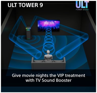 Når den ikke bruges til musik, kan ULT Tower 9 nemt tilsluttes de fleste TV'er ved hjælp af det medfølgende optiske kabel. Tryk blot på TV Sound Booster-knappen for at nyde en kraftfuld, biograflignende lydoplevelse, der forbedrer dine yndlingsserier og film.