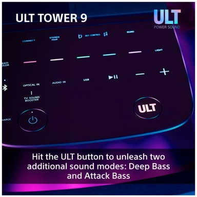 ULT Tower 9 har to kraftfulde ULT lydtilstande, der aktiveres med ULT-knappen. Deep Bass forstærker lave frekvenser for en rig, resonerende dybde, mens Attack Bass øger lydtrykket for ekstra energi, volumen og impact.