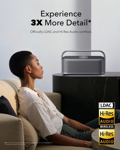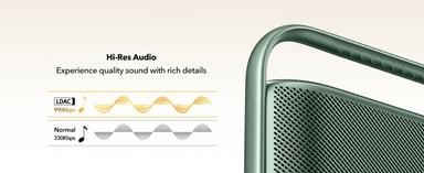 Højttaleren er certificeret til Hi-Res Audio, hvilket betyder, at den kan gengive lyd med exceptionel klarhed og detalje, så du kan høre subtile nuancer i din musik. Den understøtter LDAC-codec over Bluetooth 5.3, hvilket muliggør streaming af højopløsningslyd fra kompatible enheder og sikrer detaljeret og dynamisk lydgengivelse.