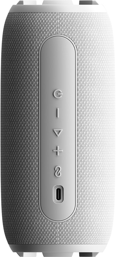 Tag din musik med overalt takket være et praktisk bærbart cylindrisk design og let vægt for nem transport. Højttaleren er dækket af et holdbart ABS- og stofmateriale. Den har knapper på højttaleren til at styre lydstyrke, afspilning, Bluetooth-forbindelse og tænd/sluk.