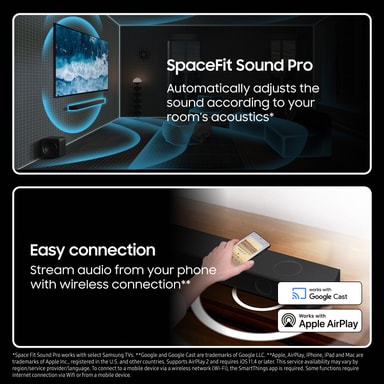 Par denne soundbar med et kompatibelt Samsung TV for at skabe en utrolig lydscene, hvor dit TV, soundbar og TV-højttalere arbejder i perfekt harmoni. Resultatet er en omsluttende surroundlyd, som du ikke let vil glemme.