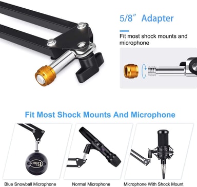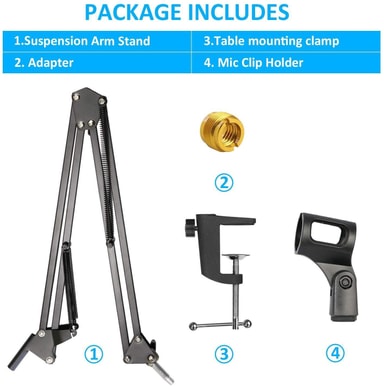Indhold: Mikrofonstativ, mikrofonholder, bordklemme, 3/8"" til 5/8"" adapter