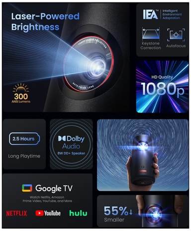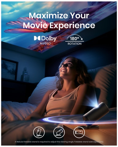 Takket være et kompakt, bærbart design og fremragende video- og lydkvalitet er Nebula Capsule 3 laserprojektoren perfekt til at se film på eller game på farten. Med Full HD-opløsning og en lysstyrke på 300 ANSI lumen leverer den klare og levende billeder, der passer til forskellige omgivelser. De 8W Dolby Digital-højttalere giver en fyldig surroundlyd, der ikke skuffer. Projektoren er udstyret med en laserlyskilder, der sikrer en lang levetid på op til 30.000 timer, mens autofokus og keystonekorrektion sikrer nem betjening. Med 2,5 timers batteri til at se film eller 8 timers batteri til at lytte til musik kan denne letvægtsprojektorer bruges hvor som helst og når som helst.