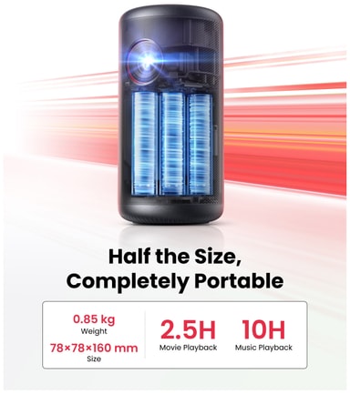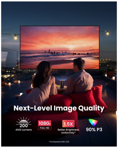 Saml venner og familie til film på storskærm med Nebula Capsule 3 projektoren. Med Full HD-opløsning og en lysstyrke på 200 ANSI lumen leverer den klare og levende billeder, der passer til forskellige miljøer. Den automatiske fokus og keystone-korrektion sikrer nem betjening, og du kan nyde op til 2,5 timers batteri til at se film eller 8 timers batteri til at lytte til musik.