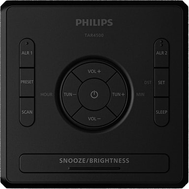 Clockradioen har store knapper på toppanelet for nem betjening. Med et enkelt tryk på en knap kan du slumre, justere lysstyrken, styre lydstyrken, vælge en radiostation eller vise sommertid.