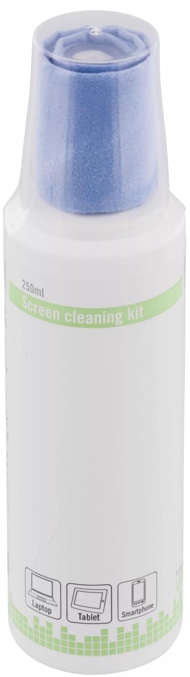 Skærmrengøringskit til alle typer af skærme. Kittet består af 250ml rengøringsvæske og en microfiberklud. Microfiberkluden kan håndvaskes i varmt vand. Alkoholfri og biologisk nedbrydelig.