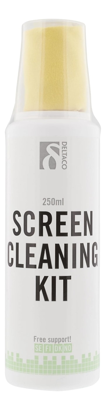 DELTACO skærmrengøringskit, 250ml, til rengøring af skær me microfiberklud, alkoholfri, biologiskt nedbrydeligSkærmrengøringskit til alle typer af skærme. Kittet består af 250ml rengøringsvæske og en microfiberklud.Læs mere om produktet