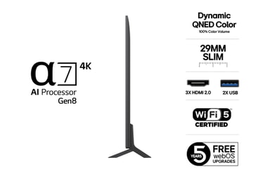 LG QNED byder på imponerende lysstyrke, skarp kontrast og levende farver – perfekt til både hverdags-TV og de helt store underholdningsøjeblikke. Med bløde, flydende bevægelser og et stilrent, moderne design leverer QNED en førsteklasses TV-oplevelse, der både ser godt ud og præsterer på højeste niveau.