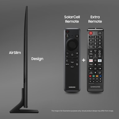 *Udvalget af apps og tjenester varierer over tid, fordi gamle kan blive fjernet, og nye kan blive tilføjet. Visse apps og tjenester kræver abonnement eller engangskøb for at kunne bruges. Samsung kan vise reklamer og kampagner på Smart TV-grænsefladen og i apps. Skærmspejling fungerer kun, når TV'et og mobilen er tændt og forbundet til samme Wi-Fi-netværk. Apple og AirPlay er varemærker tilhørende Apple Inc., registreret i USA og andre lande og regioner. AirPlay kræver iOS 12.3 eller nyere eller macOS 10.14.5 eller nyere.
