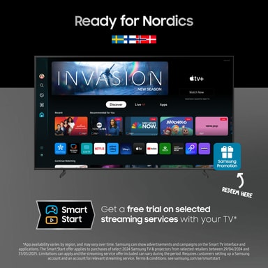 *Gælder ved køb af udvalgte Samsung TV-modeller fra 2024 og udvalgte projektorer på samsung.com og hos udvalgte forhandlere i perioden fra 29.04.2024 til 31.03.2025. Der kan være begrænsninger, og udvalget af inkluderede streamingtjenester kan variere i kampagnens løbetid. Kræver Samsung-konto og oprettelse af en konto hos den pågældende streamingtjeneste. Læs vilkårene på samsung.com/dk/smartstart.