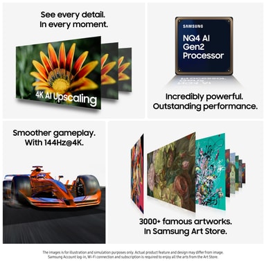 Samsungs kraftfulde NQ4 AI Gen2-processor bruger 20 AI-neurale netværk til at opskalere indhold til 4K for detaljer på højt niveau, raffinerede farver og kontrast til omgivelserne. Real Depth Enhancer efterligner det menneskelige øjes funktion for at skabe en bedre fornemmelse af dybde. Dette opnås ved at gøre det fokuserede objekt mere fremtrædende ved hjælp af kontrast og definition.