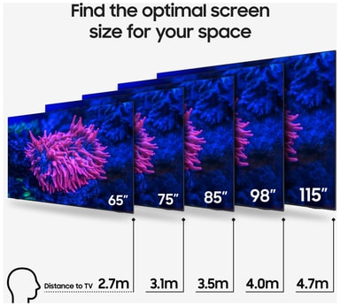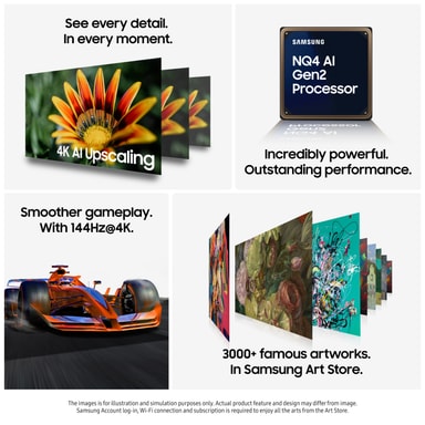 Neo QLED med Mini-LED-teknologi giver større kraft og præcision i lys og farver. AI-processor til billedbehandling og hurtige 144Hz HDMI-indgange til gaming.