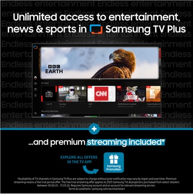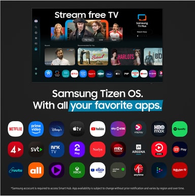 Få adgang til hundredvis af gratis kanaler, herunder Samsung TV Plus premiumkanaler og cloud gaming. Nyd sport, film, nyheder, underholdning, musik, børneprogrammer og meget mere. Der tilføjes hele tiden nyt indhold, så der altid er mere at udforske.*